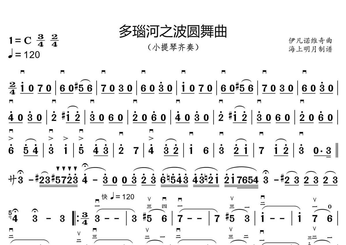 《多瑙河之波圆舞曲》是伊凡诺维奇演唱的一首歌曲,拍号为3/4拍,这份小提琴谱共有三张高清图谱,图谱由 @海上明月 编配上传。