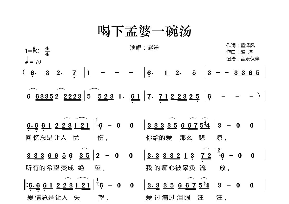 喝下孟婆一碗汤简谱 - 赵洋演唱