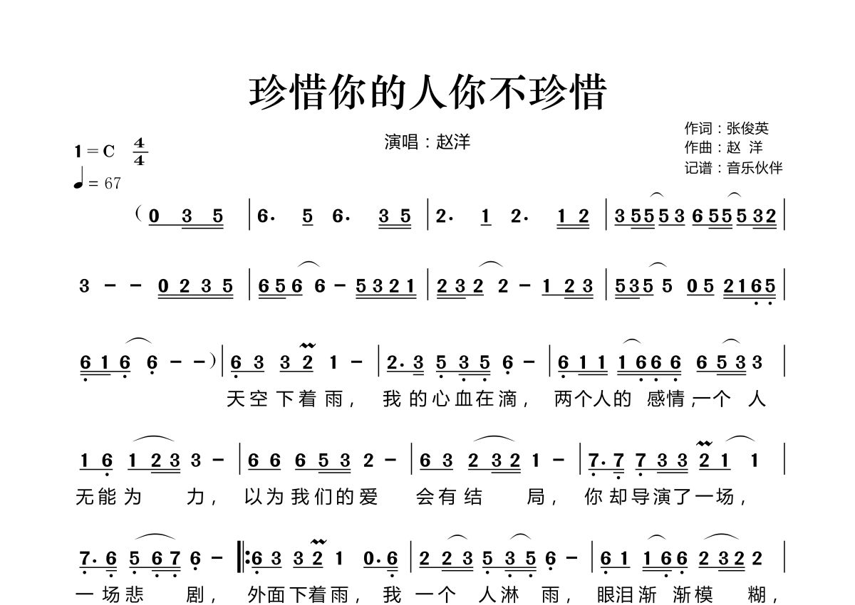 珍惜你的人你不珍惜简谱 - 赵洋演唱