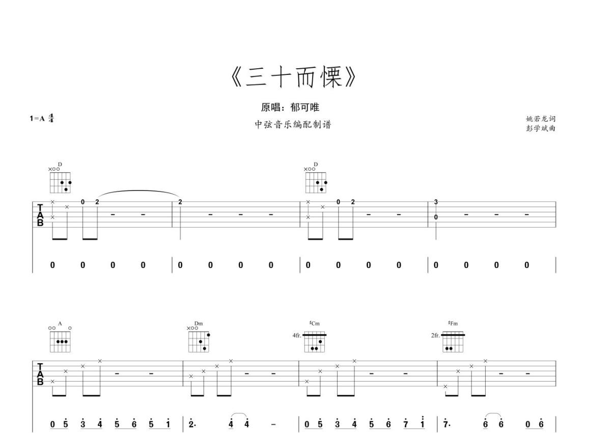 《三十而慄》是郁可唯演唱的一首歌曲,本吉他谱采用的是A调指法编配,这份吉他谱共有四张高清图谱,图谱由 @中弦音乐 编配上传,图谱使用六线谱编配,包含吉他和弦指法、简谱以及歌词部分,曲谱配备了相关的视频提供浏览,使用这份三十而慄吉他谱,可以让你更加方便地掌握这首歌曲的弹唱技巧,快来尝试吧。本首歌曲采用A调的和弦进行编配,整首歌曲难度适中,希望大家多加练习。