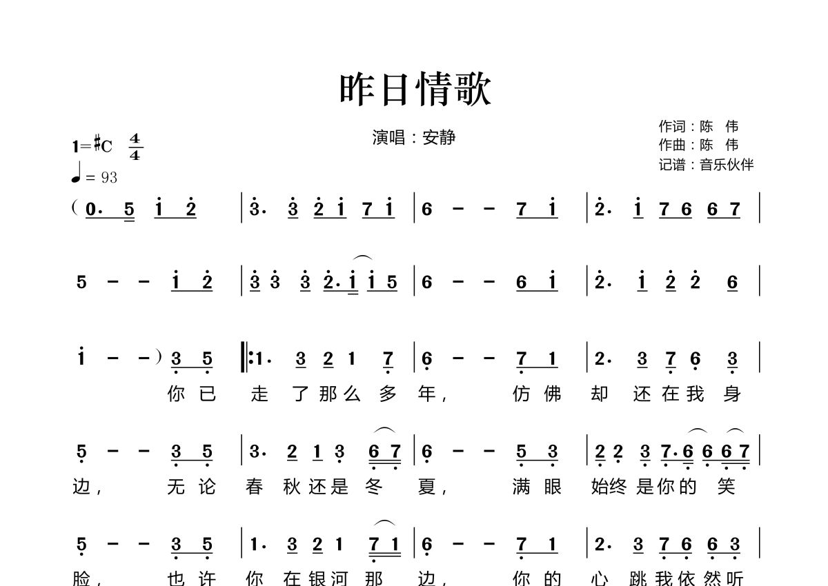 《昨日情歌》是安静演唱的一首歌曲,拍号为4/4拍,歌曲速度为每分钟93拍,这份简谱共有两张高清图谱,图谱由 @音乐伙伴 编配上传。