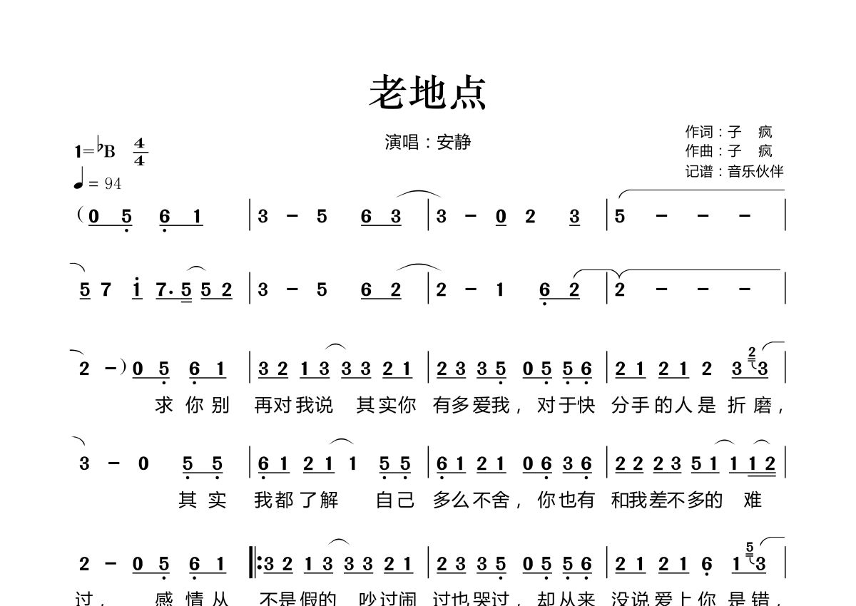 《老地点》是安静演唱的一首歌曲,拍号为4/4拍,歌曲速度为每分钟94拍,这份简谱共有两张高清图谱,图谱由 @音乐伙伴 编配上传。
