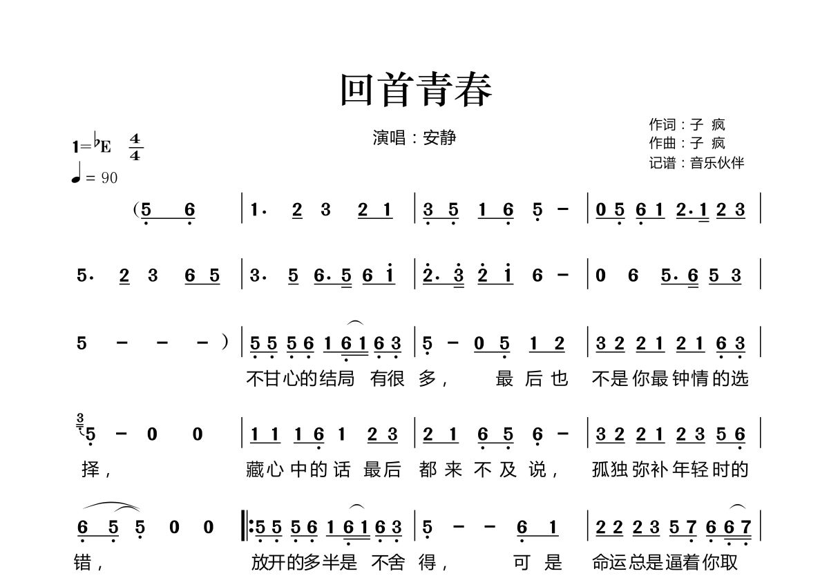《回首青春》是安静演唱的一首歌曲,拍号为4/4拍,歌曲速度为每分钟90拍,这份简谱共有两张高清图谱,图谱由 @音乐伙伴 编配上传。