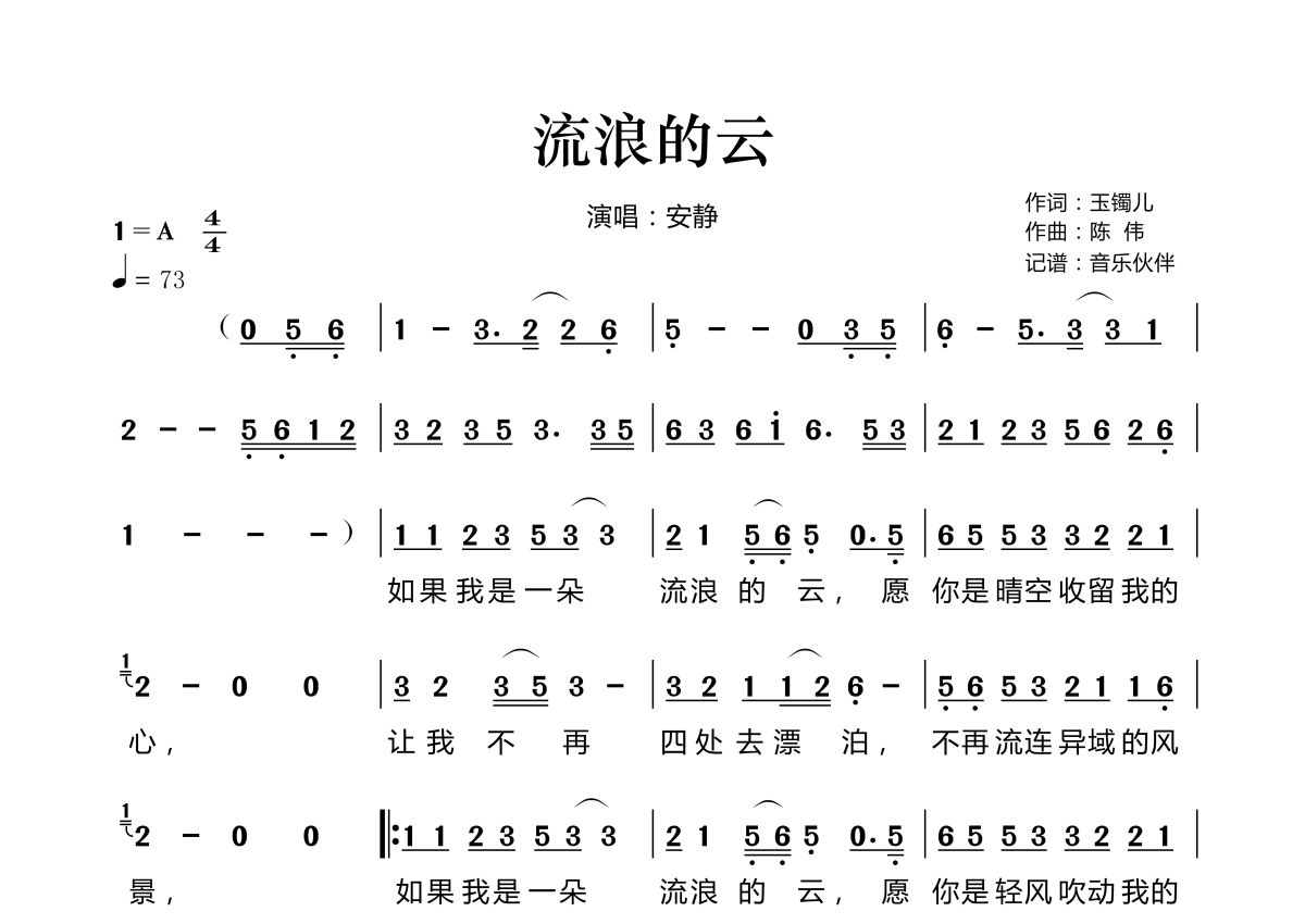 《流浪的云》是安静演唱的一首歌曲,拍号为4/4拍,歌曲速度为每分钟73拍,这份简谱共有两张高清图谱,图谱由 @音乐伙伴 编配上传。