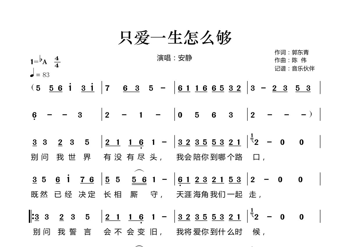 《只爱一生怎么够》是安静演唱的一首歌曲,拍号为4/4拍,歌曲速度为每分钟83拍,这份简谱共有两张高清图谱,图谱由 @音乐伙伴 编配上传。