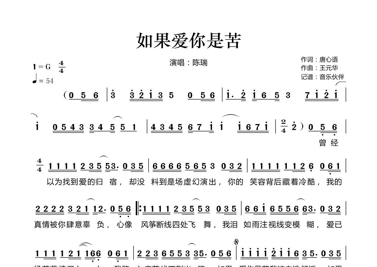 《如果爱你是苦》是陈瑞演唱的一首歌曲,拍号为4/4拍,歌曲速度为每分钟54拍,这份简谱共有一张高清图谱,图谱由 @音乐伙伴 编配上传。