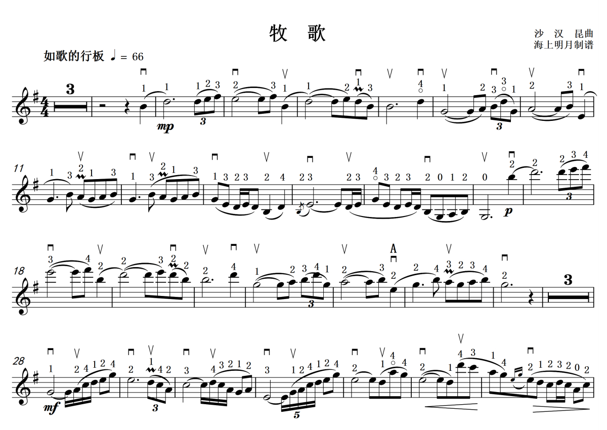 《牧歌》是沙汉昆演唱的一首歌曲,拍号为4/4拍,这份小提琴谱共有一张高清图谱,图谱由 @海上明月 编配上传。