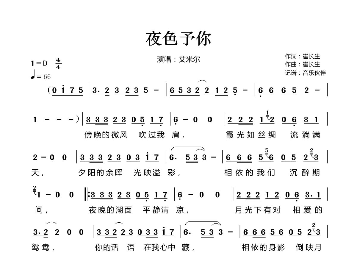 《夜色予你》是艾米尔演唱的一首歌曲,拍号为4/4拍,歌曲速度为每分钟66拍,这份简谱共有一张高清图谱,图谱由 @音乐伙伴 编配上传。