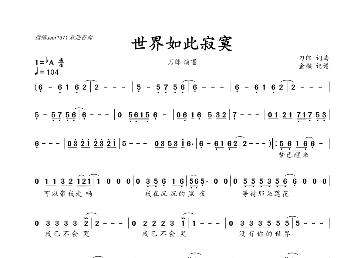 《世界如此寂寞》是刀郎演唱的一首歌曲,拍号为4/4拍,歌曲速度为每分钟104拍,这份简谱共有两张高清图谱,图谱由 @金猴奋起千钧棒 编配上传。