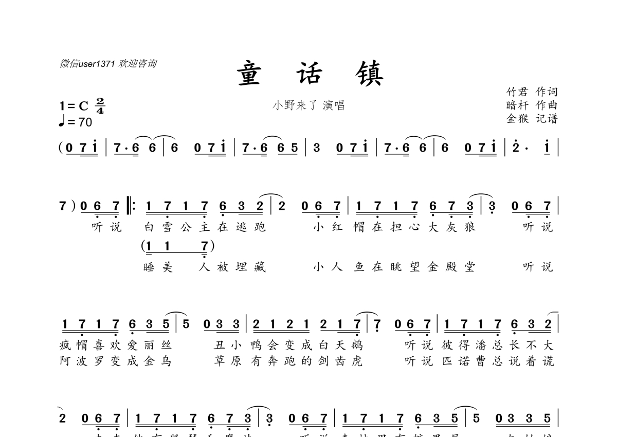 《童话镇》是小野来了演唱的一首歌曲,拍号为2/4拍,歌曲速度为每分钟70拍,这份简谱共有两张高清图谱,图谱由 @金猴奋起千钧棒 编配上传。