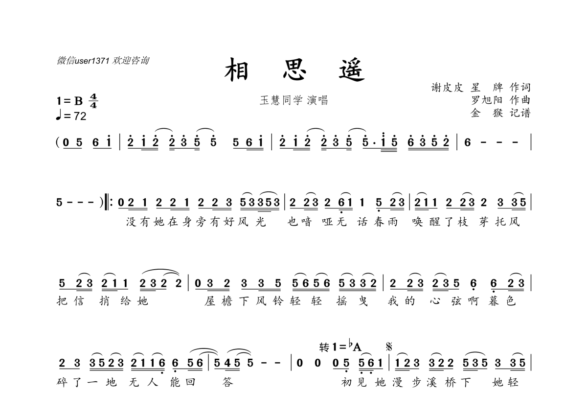 《相思谣》是玉慧同学演唱的一首歌曲,拍号为4/4拍,歌曲速度为每分钟72拍,这份简谱共有一张高清图谱,图谱由 @金猴奋起千钧棒 编配上传。