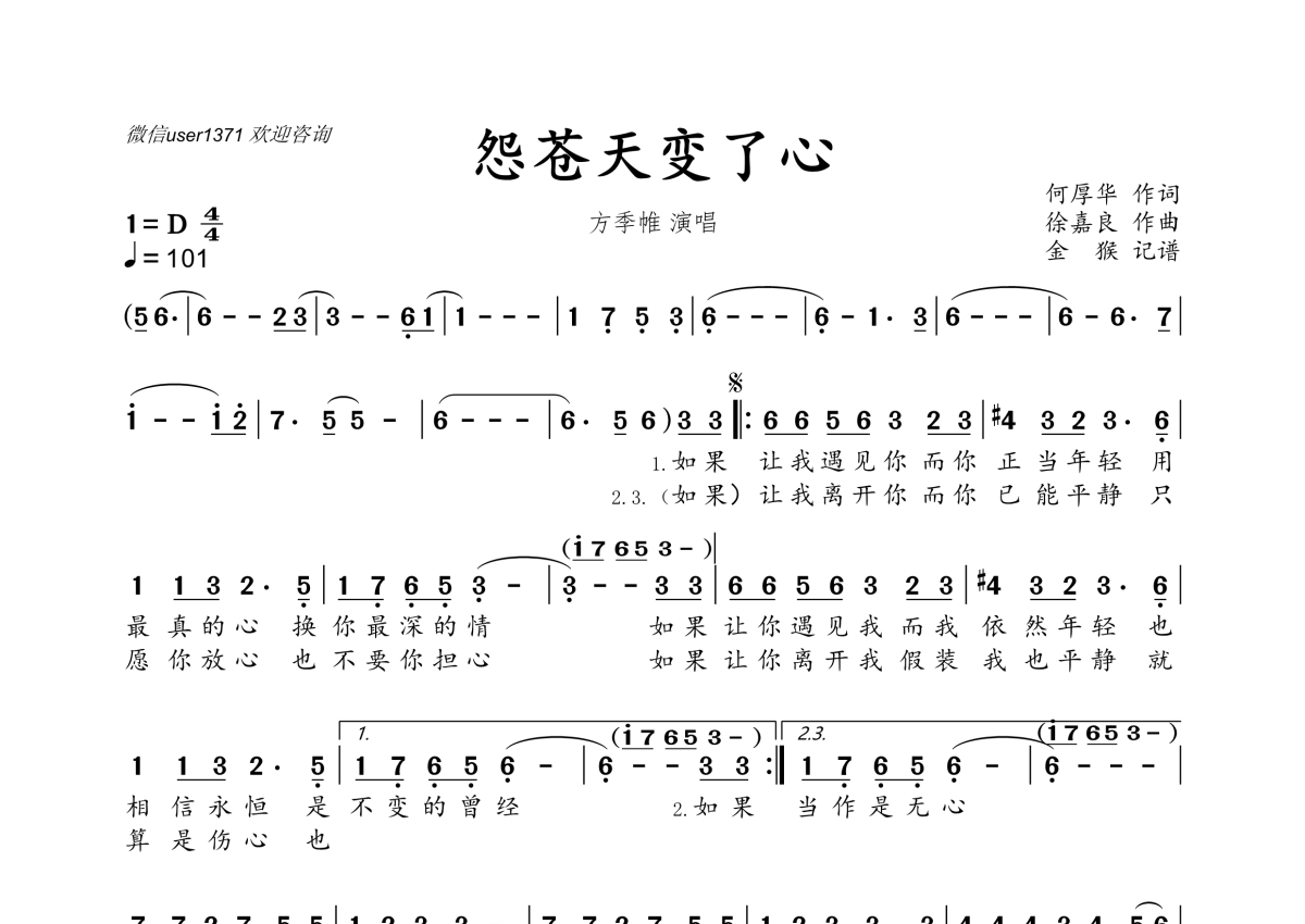 《怨苍天变了心》是方季帷演唱的一首歌曲,拍号为4/4拍,歌曲速度为每分钟101拍,这份简谱共有一张高清图谱,图谱由 @金猴奋起千钧棒 编配上传。