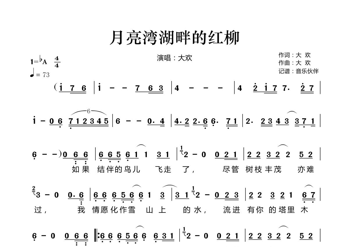 《月亮湾湖畔的红柳》是大欢演唱的一首歌曲,拍号为4/4拍,歌曲速度为每分钟73拍,这份简谱共有两张高清图谱,图谱由 @音乐伙伴 编配上传。