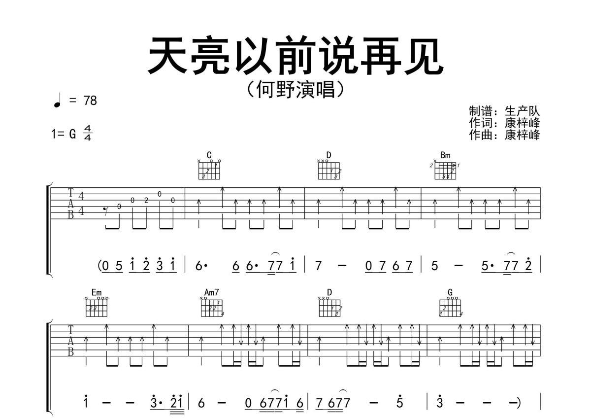 何野《天亮以前说再见》吉他谱 - G调弹唱六线谱 - 精编完美版