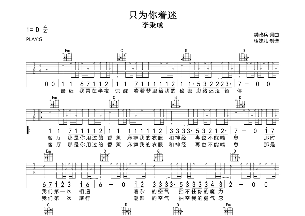 李秉成《只为你着迷》吉他谱 - G调弹唱六线谱