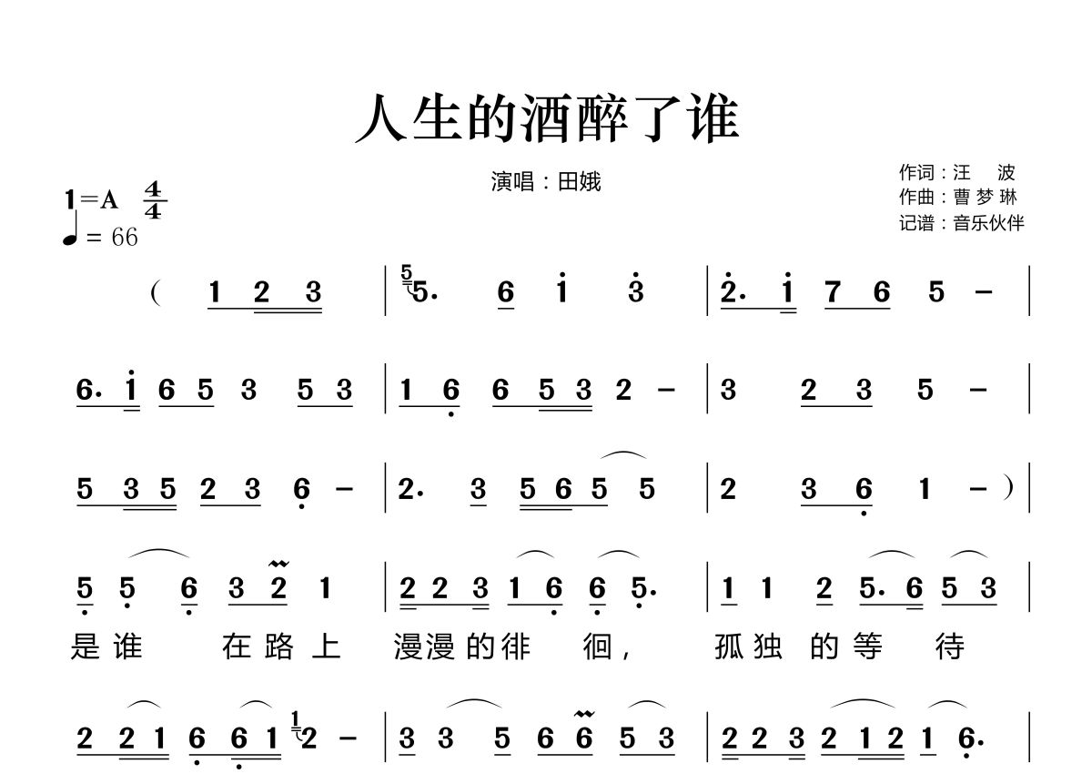 《人生的酒醉了谁》是田娥演唱的一首歌曲,这份简谱共有两张高清图谱,图谱由 @音乐伙伴 编配上传。