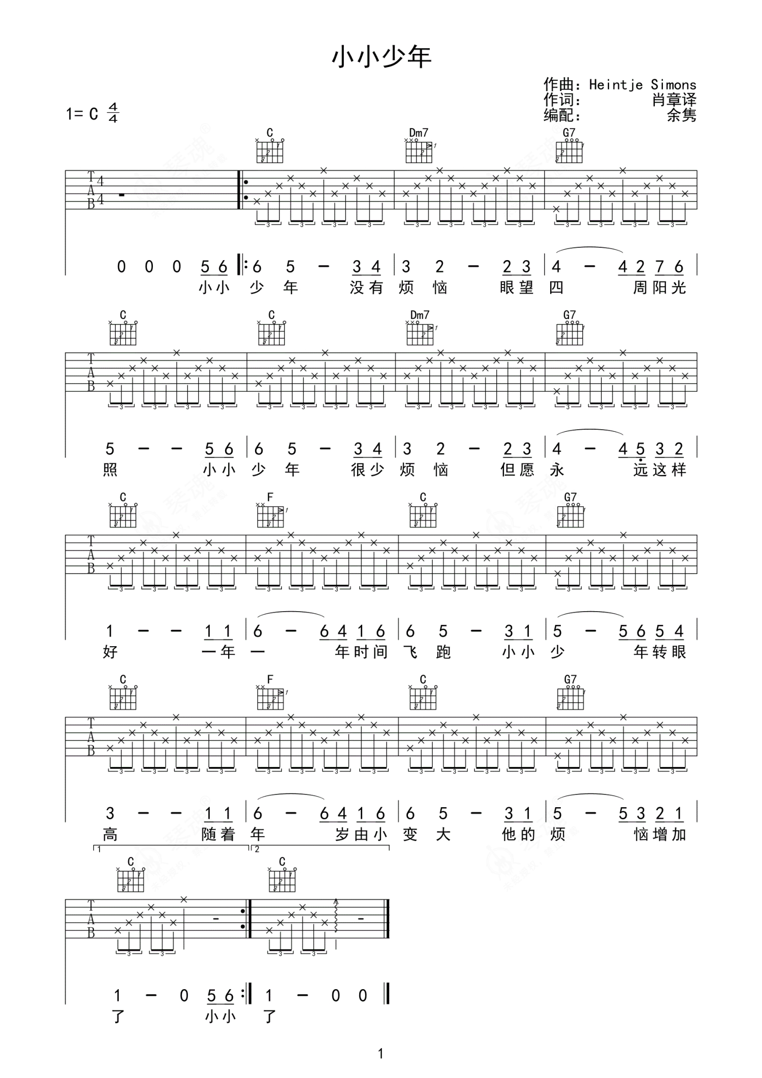 Heintje Simons《小小少年》吉他谱 - C调弹唱六线谱