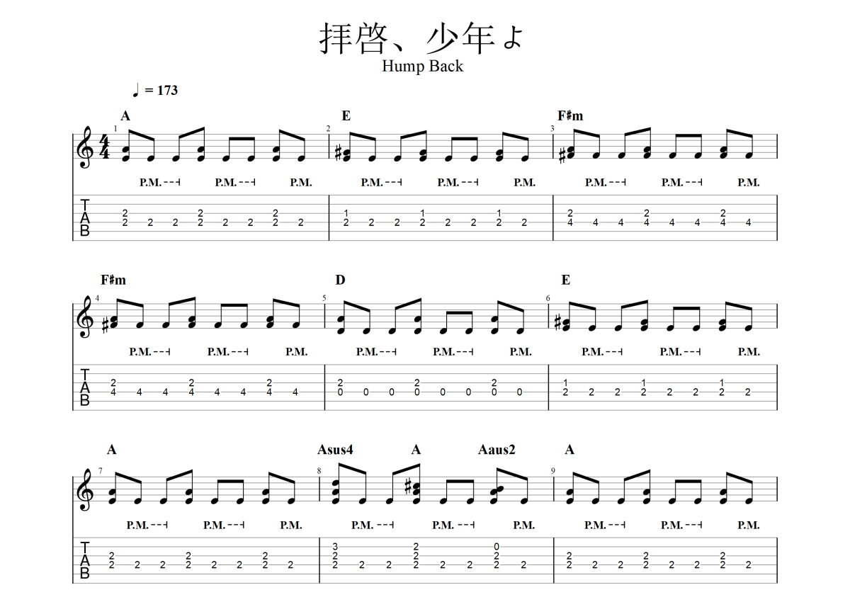 《拝啓、少年よ》是hump back乐队演唱的一首歌曲,原版,歌曲速度为每分钟173拍,歌曲原调为A调,这份电吉他谱共有六张高清图谱,图谱由 @mono 编配上传,图谱使用六线谱编配,曲谱配备了相关的音频提供试听,使用这份拝啓、少年よ电吉他谱,可以让你更加方便地掌握这首歌曲的演奏技巧,快来尝试吧。
