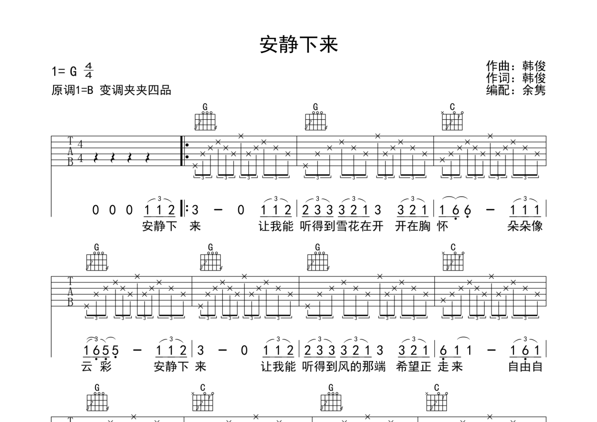 韩俊《安静下来》吉他谱 - G调弹唱六线谱
