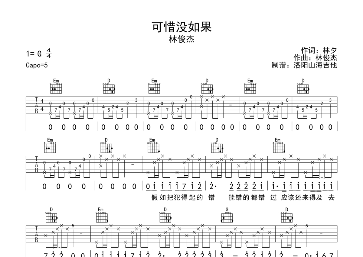 林俊杰《可惜没如果》吉他谱 - G调弹唱六线谱