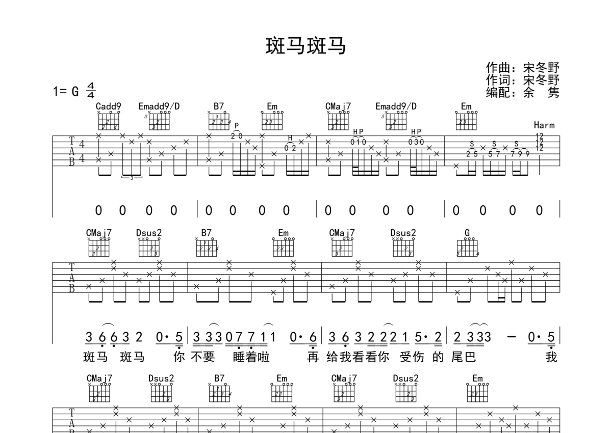 斑马斑马吉他谱 - 宋冬野演唱 - G调弹唱六线谱