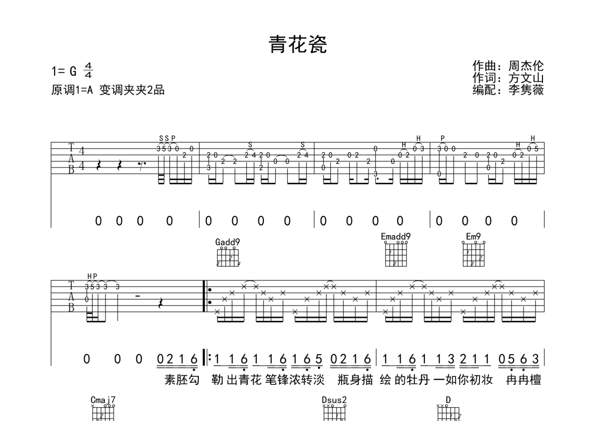 《青花瓷》是周杰伦演唱的一首歌曲,拍号为4/4拍,歌曲原调为A调,但由于原调指法比较难,为了方便弹奏,本吉他谱采用的是G调指法编配,变调夹2品弹奏即为原调,当然也可以根据自己的音域改变变调夹位置,或者通过改变和弦调性,以方便自己弹奏,这份吉他谱共有两张高清图谱,图谱由 @蘑菇 编配上传,图谱使用六线谱编配,包含吉他和弦指法、简谱以及歌词部分,使用这份青花瓷吉他谱,可以让你更加方便地掌握这首歌曲的弹唱技巧,快来尝试吧。曲谱包含前奏和第一段主副歌弹法 第二段用同样和弦完成即可。