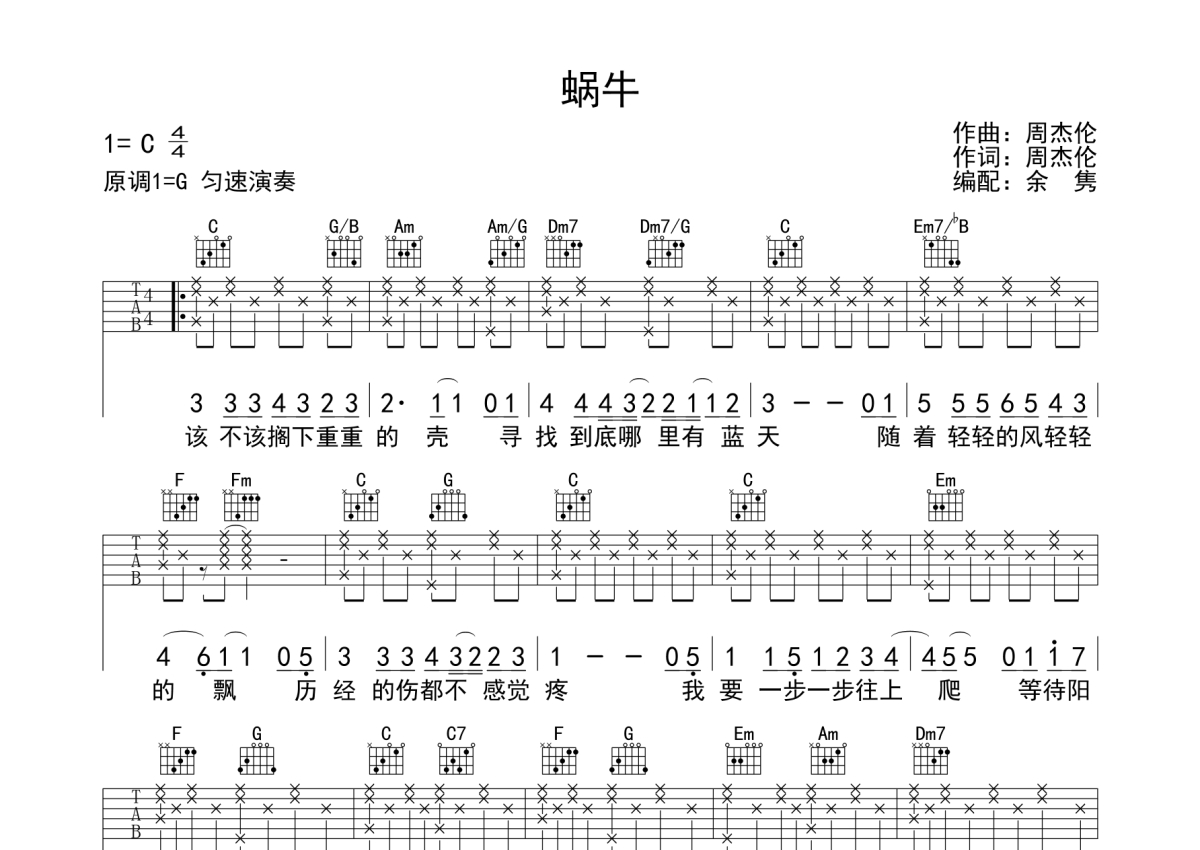 周杰伦《蜗牛》吉他谱 - C调弹唱六线谱