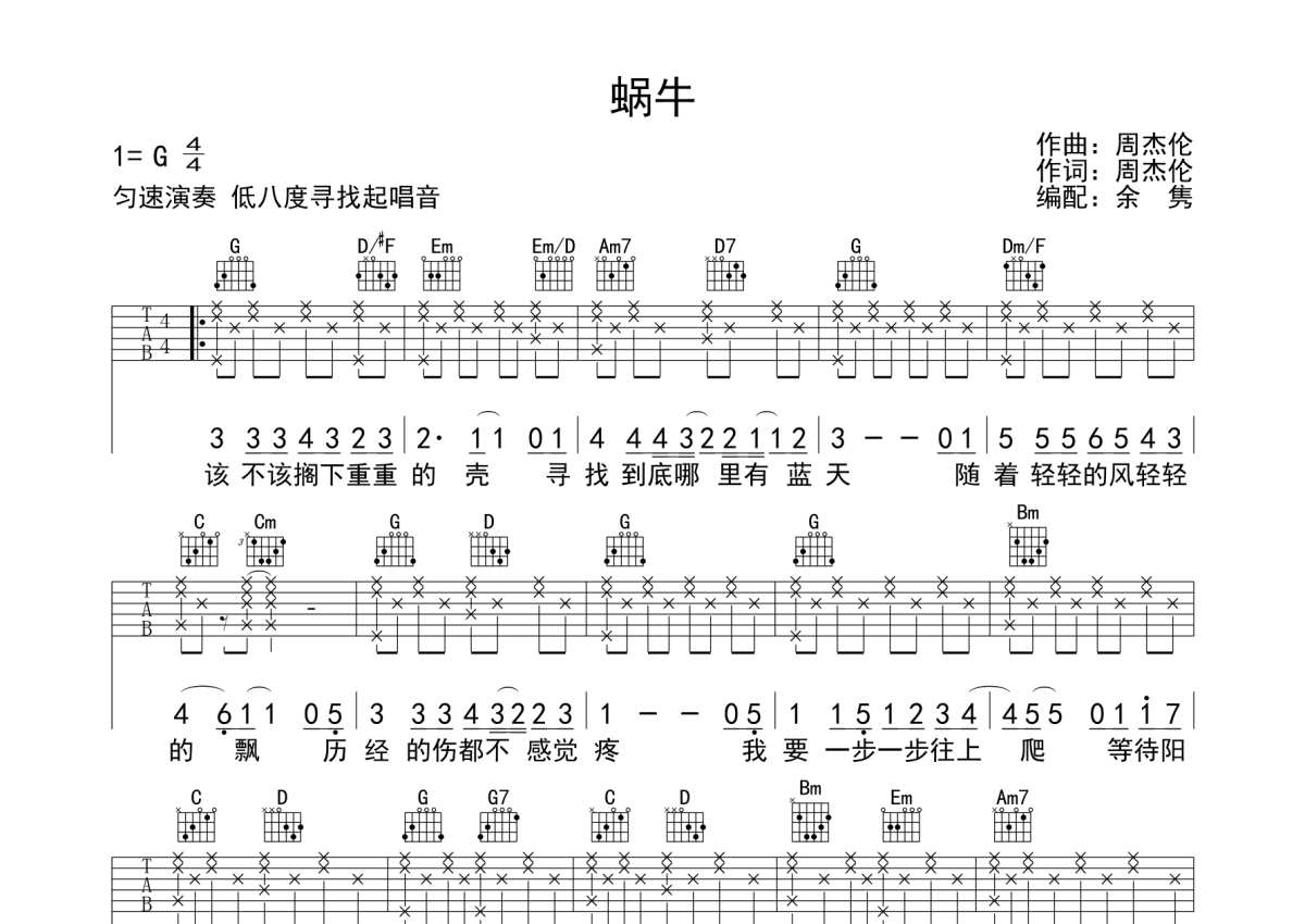 蜗牛吉他谱 - 周杰伦演唱 - G调弹唱六线谱