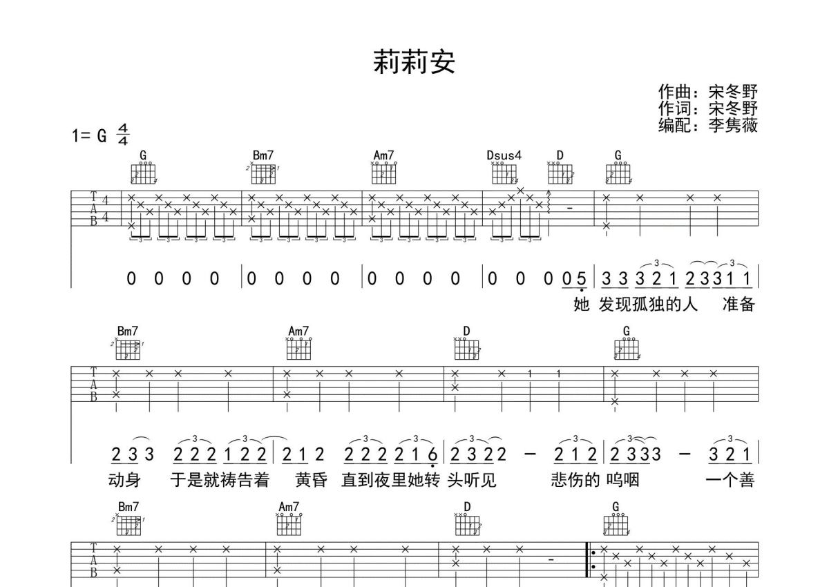 宋冬野《莉莉安》吉他谱 - G调弹唱六线谱