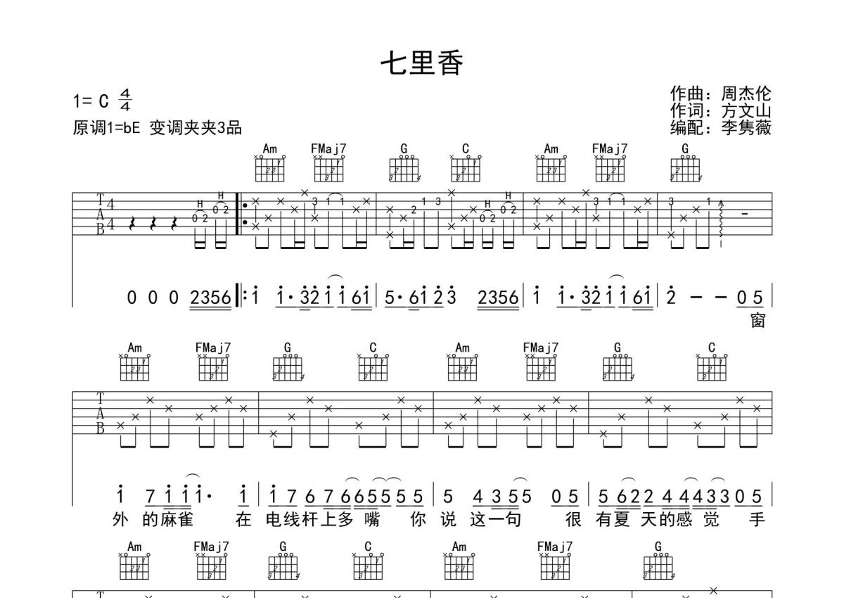 《七里香》是周杰伦演唱的一首歌曲,拍号为4/4拍,歌曲原调为Eb调,但由于原调指法比较难,为了方便弹奏,本吉他谱采用的是C调指法编配,变调夹3品弹奏即为原调,当然也可以根据自己的音域改变变调夹位置,或者通过改变和弦调性,以方便自己弹奏,这份吉他谱共有两张高清图谱,图谱由 @蘑菇 编配上传,图谱使用六线谱编配,包含吉他和弦指法、简谱以及歌词部分,使用这份七里香吉他谱,可以让你更加方便地掌握这首歌曲的弹唱技巧,快来尝试吧。