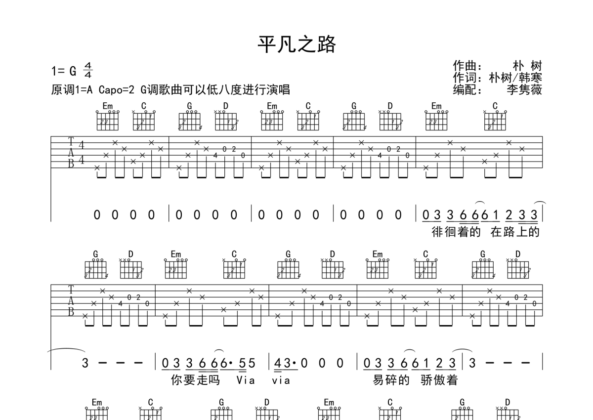 平凡之路吉他谱 - 朴树演唱 - G调弹唱六线谱