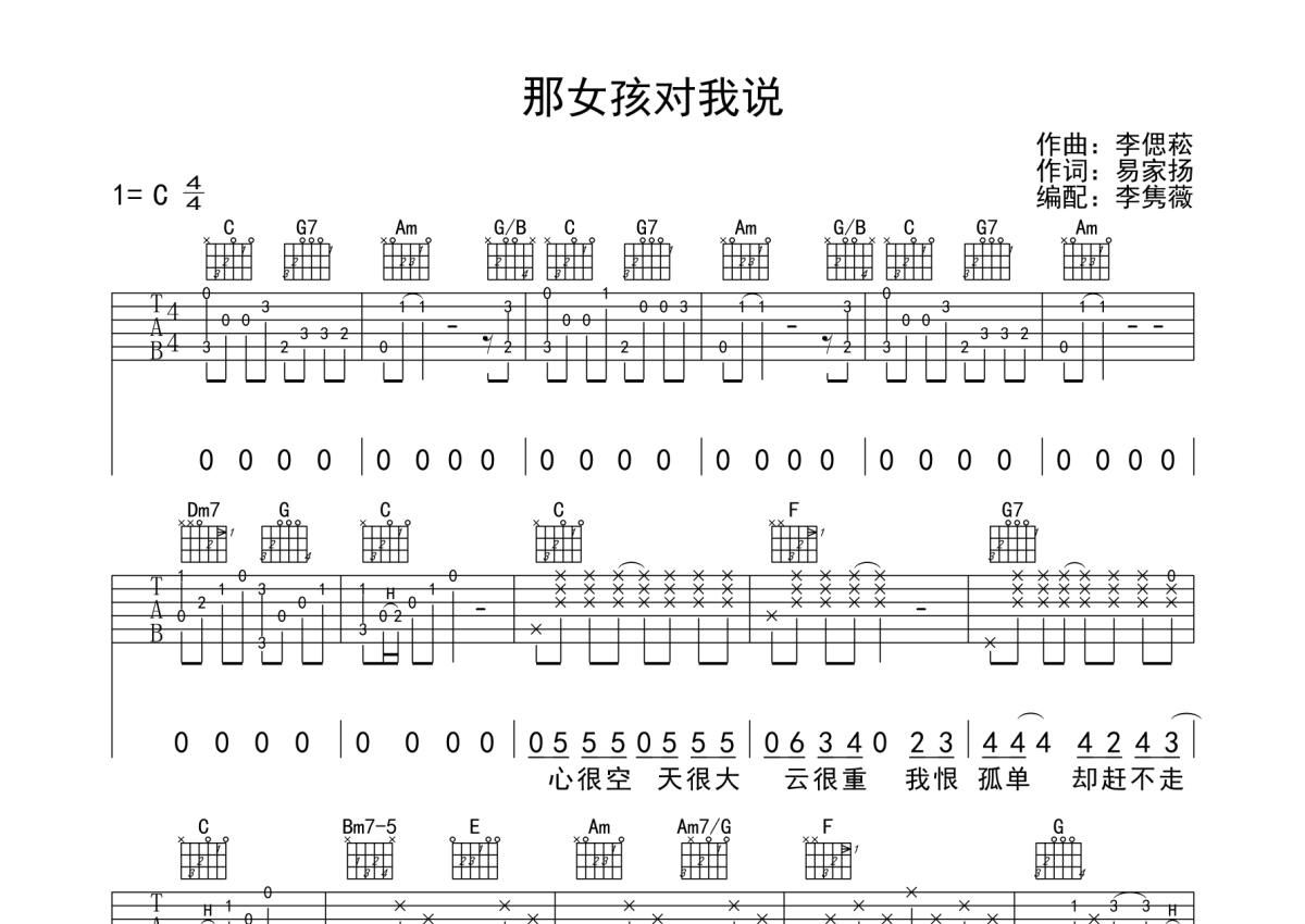 黄义达《那女孩对我说》吉他谱 - C调弹唱六线谱
