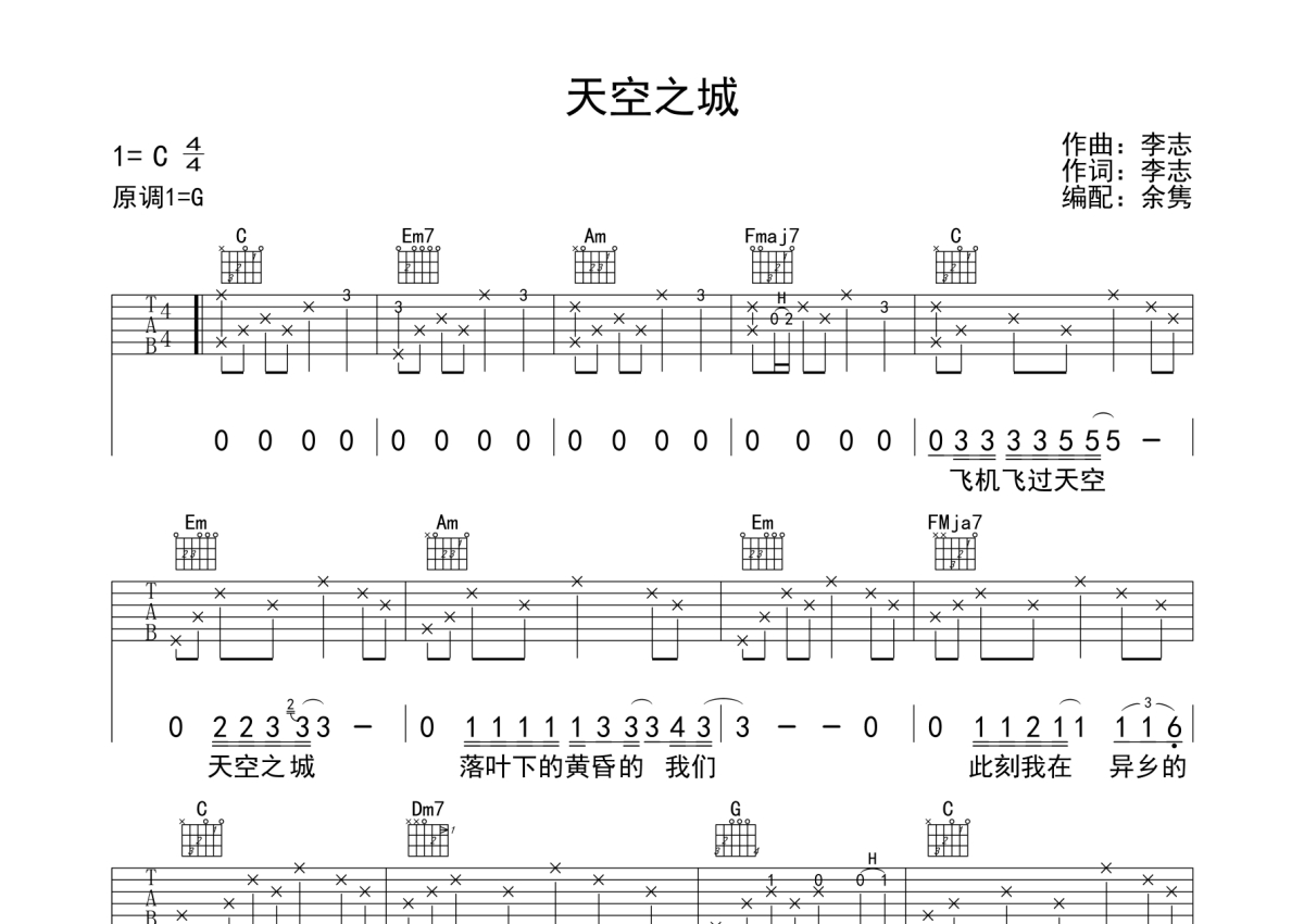 李志《天空之城》吉他谱 - C调弹唱六线谱