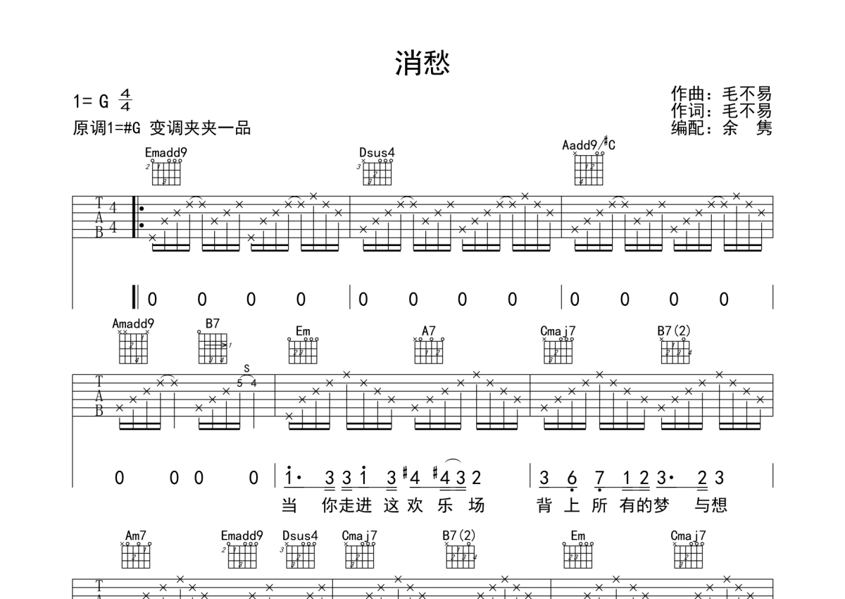 消愁吉他谱 - 毛不易演唱 - G调弹唱六线谱