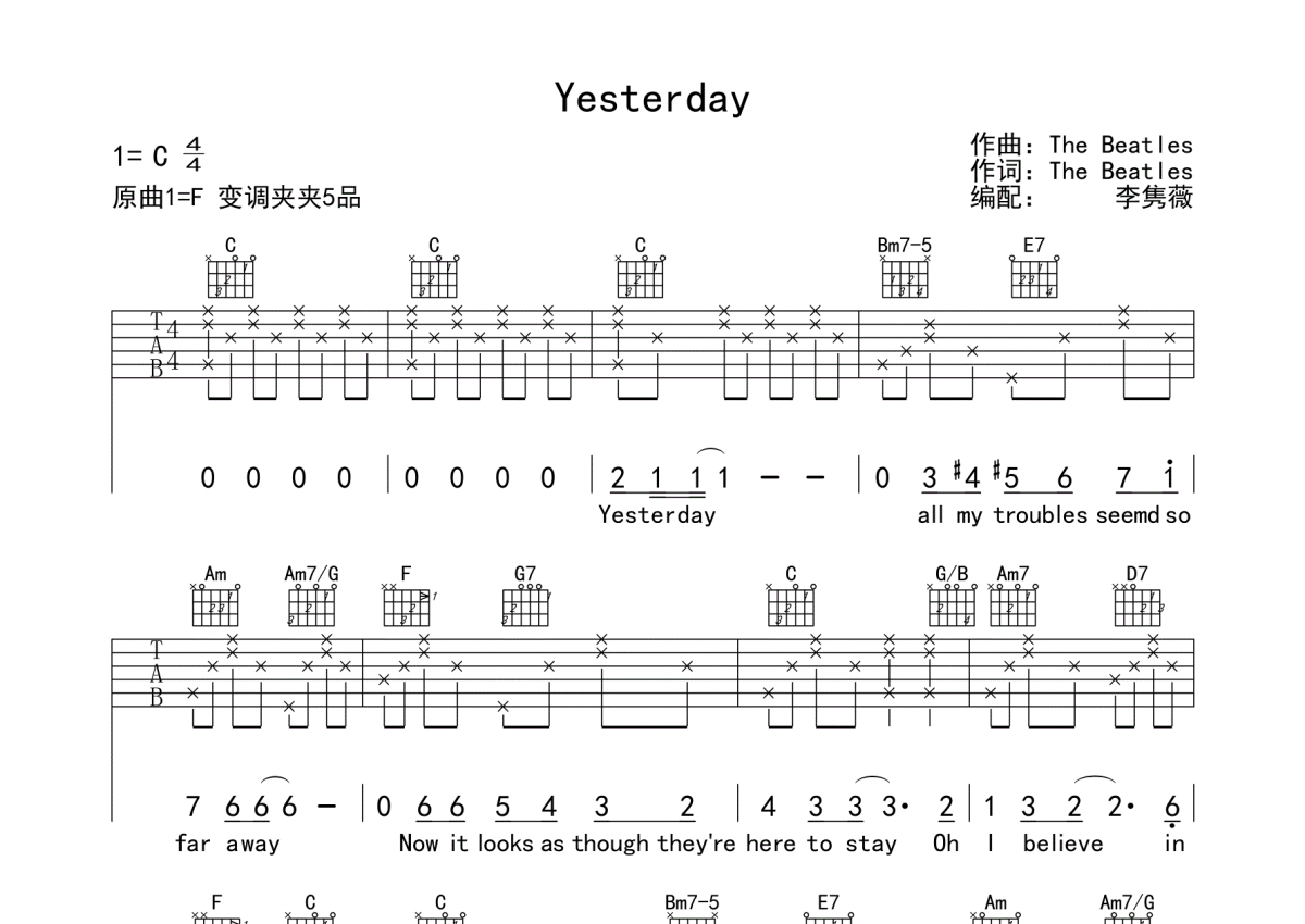 《Yesterday》是The Beatles演唱的一首歌曲,拍号为4/4拍,歌曲原调为F调,但由于原调指法比较难,为了方便弹奏,本吉他谱采用的是C调指法编配,变调夹5品弹奏即为原调,当然也可以根据自己的音域改变变调夹位置,或者通过改变和弦调性,以方便自己弹奏,这份吉他谱共有两张高清图谱,图谱由 @蘑菇 编配上传,图谱使用六线谱编配,包含吉他和弦指法、简谱以及歌词部分,使用这份Yesterday吉他谱,可以让你更加方便地掌握这首歌曲的弹唱技巧,快来尝试吧。