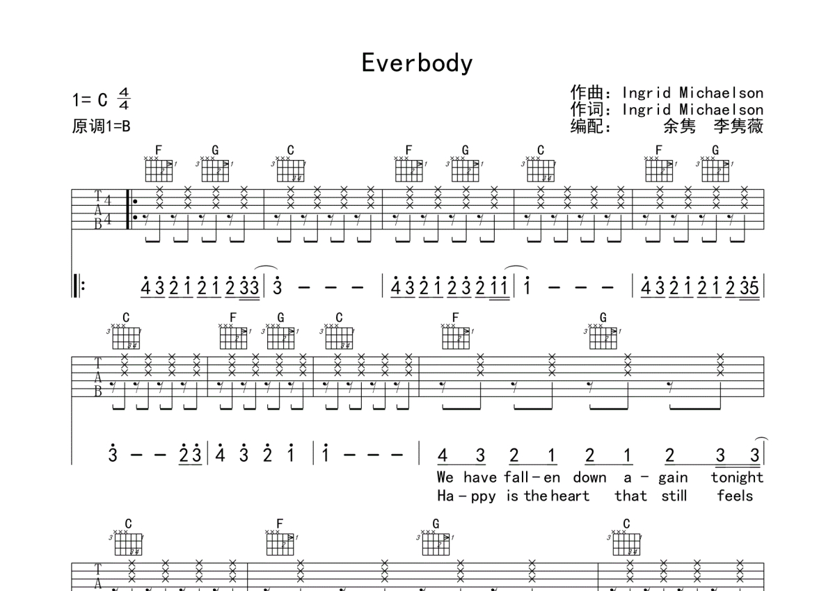 Ingrid Michaelson《Everybody》吉他谱 - C调弹唱六线谱