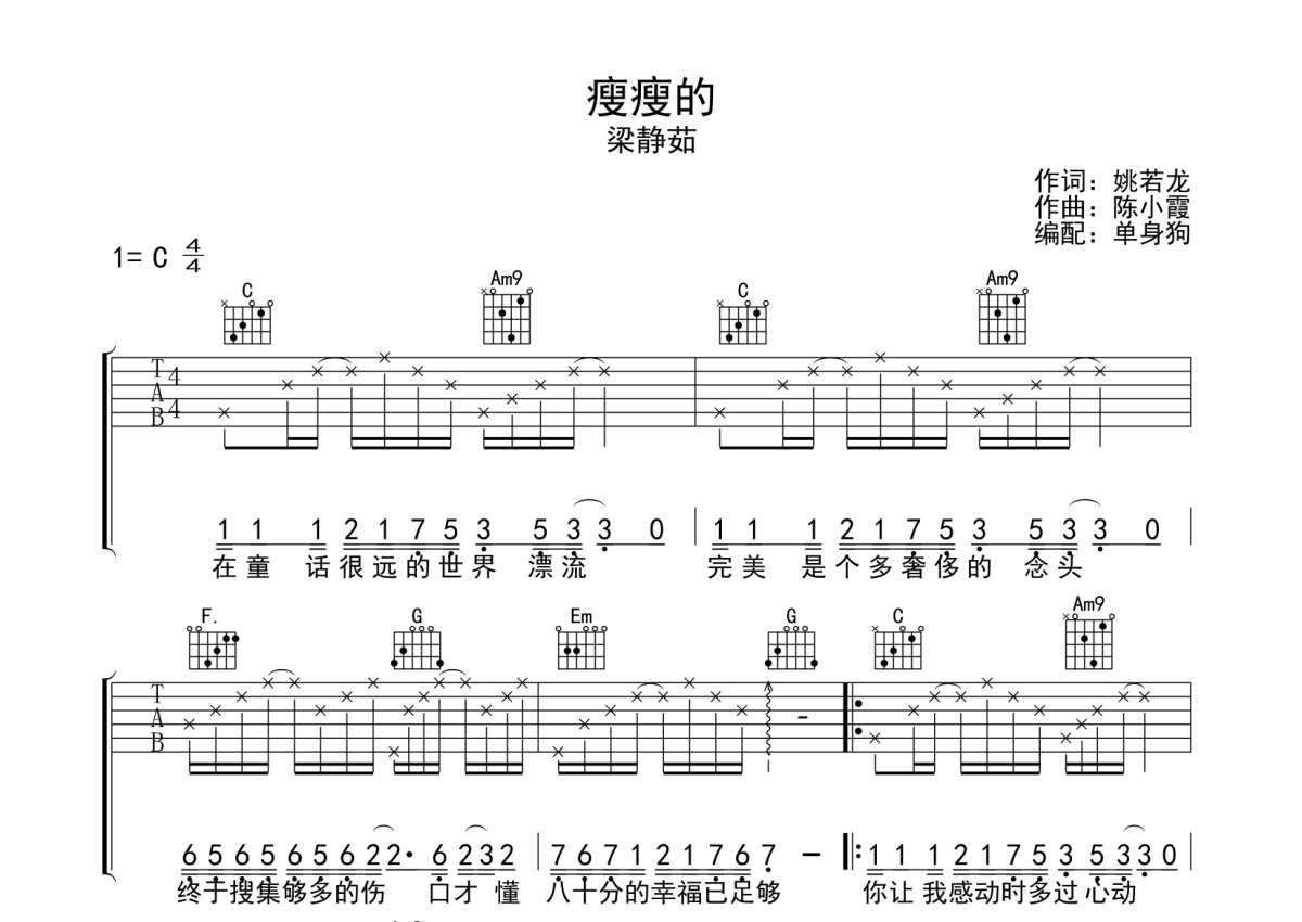 梁静茹《瘦瘦的》吉他谱 - C调弹唱六线谱