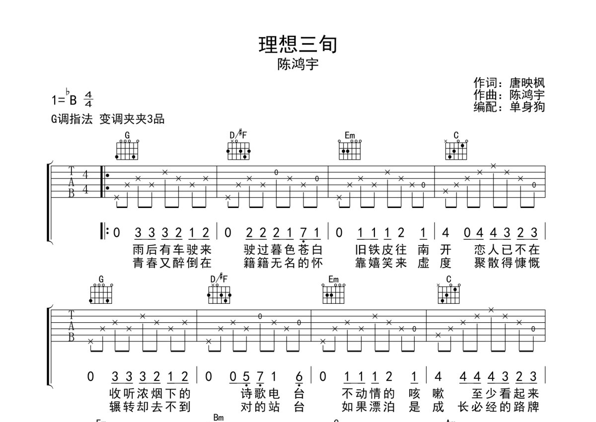 陈鸿宇《理想三旬》吉他谱 - G调弹唱六线谱