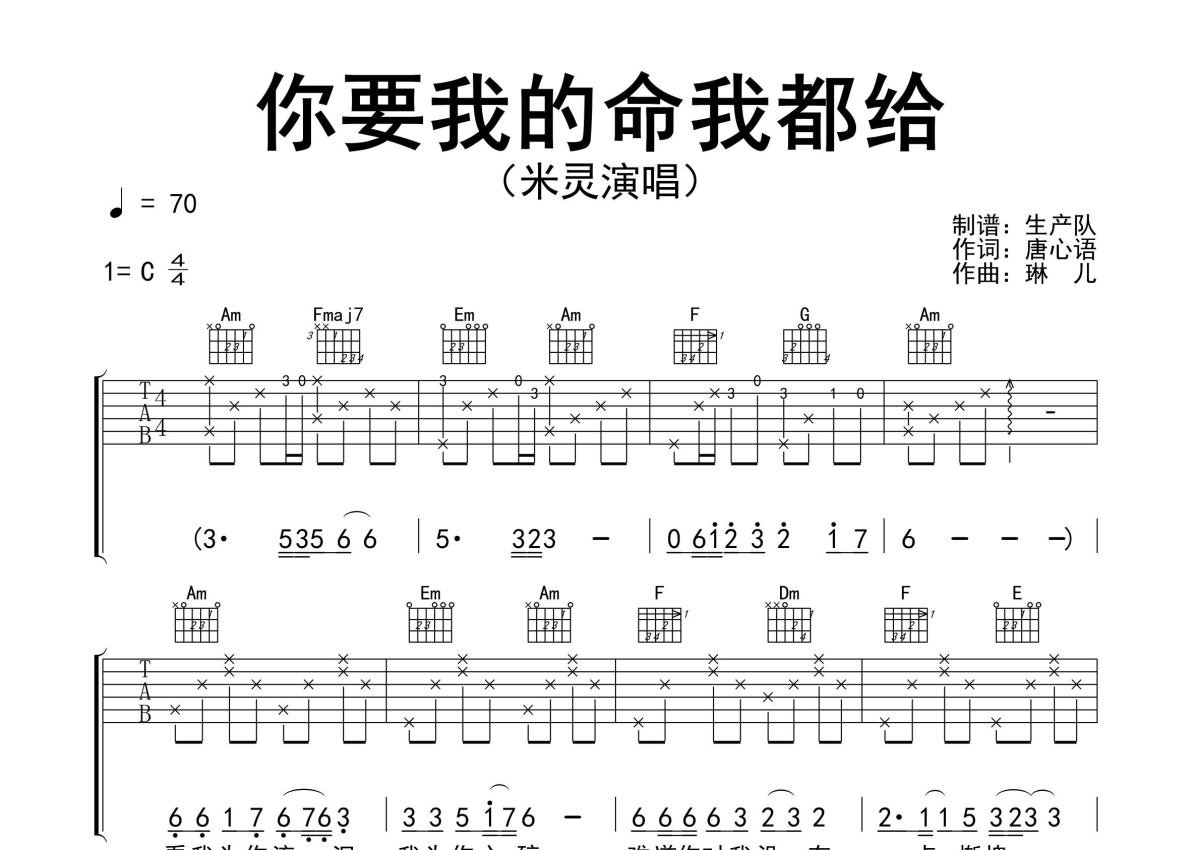 《你要我的命我都给》是米灵演唱的一首歌曲,精编完美版,拍号为4/4拍,歌曲速度为每分钟70拍,歌曲原调为C调,本吉他谱采用的是C调指法编配,演奏时不需要使用变调夹即为原调,这份吉他谱共有三张高清图谱,图谱由 @生产队 编配上传,图谱使用六线谱编配,包含吉他和弦指法、简谱以及歌词部分,使用这份你要我的命我都给吉他谱,可以让你更加方便地掌握这首歌曲的弹唱技巧,快来尝试吧。米灵演唱的歌曲《你要我的命我都给》原版吉他谱,完整的前奏、间奏、尾奏SOLO编配,精编完美版,值得推荐!。