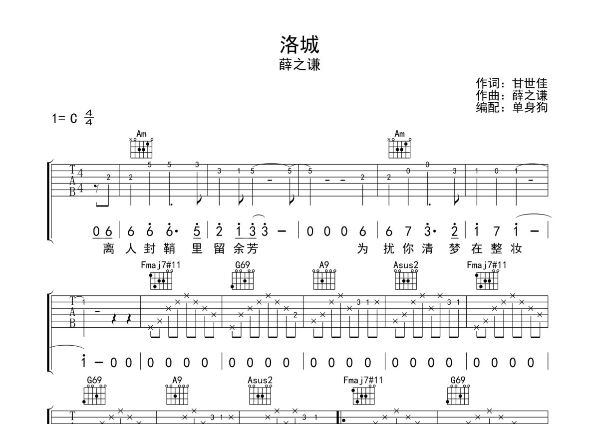 薛之谦《洛城》吉他谱 - C调弹唱六线谱