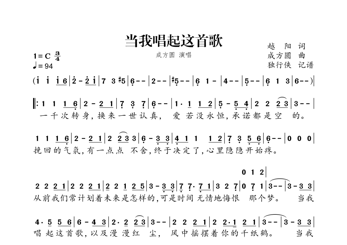 《当我唱起这首歌》是成方圆演唱的一首歌曲,拍号为3/4拍,歌曲速度为每分钟94拍,这份简谱共有一张高清图谱,图谱由 @独行侠 编配上传。