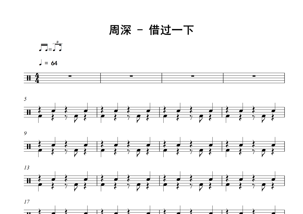 《借过一下》是周深演唱的一首歌曲,拍号为4/4拍,歌曲速度为每分钟64拍,这份架子鼓谱共有两张高清图谱,图谱由 @放晴的天空 编配上传,图谱使用五线谱编配,使用这份借过一下架子鼓谱,你将能够轻松地敲打出这首周深的借过一下,快来尝试吧。