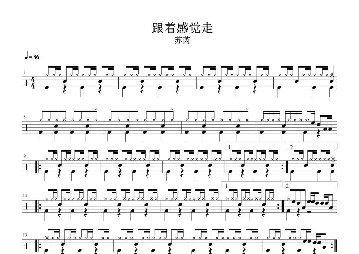 《跟着感觉走》是苏芮演唱的一首歌曲,拍号为4/4拍,歌曲速度为每分钟86拍,这份架子鼓谱共有两张高清图谱,图谱由 @老虎不说谎 编配上传,图谱使用五线谱编配,使用这份跟着感觉走架子鼓谱,你将能够轻松地敲打出这首苏芮的跟着感觉走,快来尝试吧。