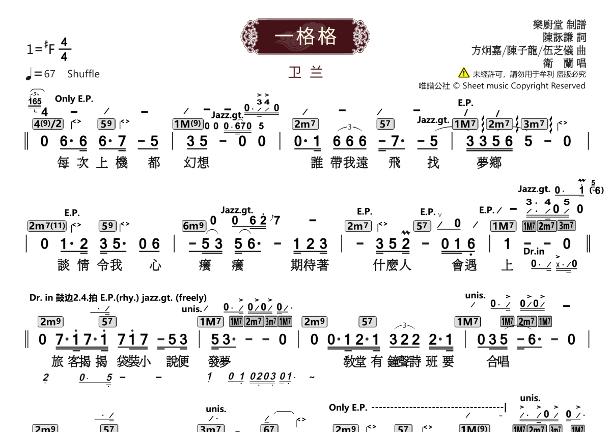 “乐厨堂”乐谱发布小组: 出版级乐谱扒谱制谱——以职业乐手圈通行标准记谱,遵循原版和声、伴奏元素和段落结构。 ❶ 2.0多功能专业团谱:采用台湾卓著公司开创的二代简谱标准制作。二代简谱无疑是迄今为止最科学、最易读的专业范畴多功能记谱方案:❷ 框架谱:采用职业乐手通常记谱方案制作。