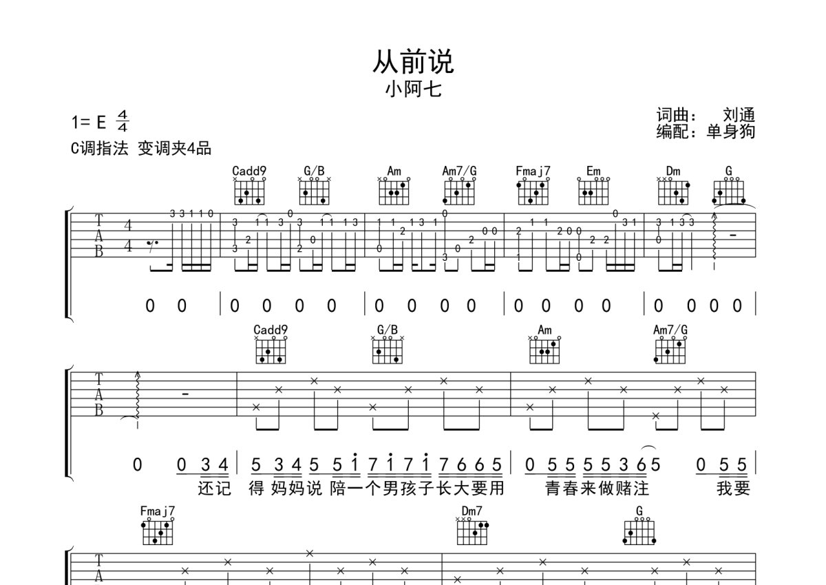 小阿七《从前说》吉他谱 - C调弹唱六线谱