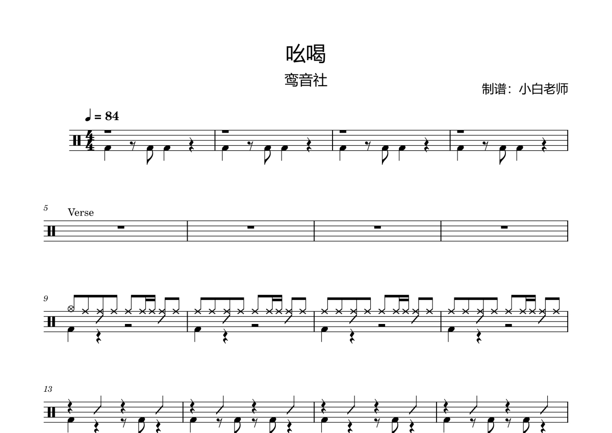 《吆喝》是鸾音社演唱的一首歌曲,拍号为4/4拍,歌曲速度为每分钟84拍,这份架子鼓谱共有两张高清图谱,图谱由 @琴魂用户_227975 编配上传,图谱使用五线谱编配,使用这份吆喝架子鼓谱,你将能够轻松地敲打出这首鸾音社的吆喝,快来尝试吧。鸾音社:吆喝 原创鼓谱。