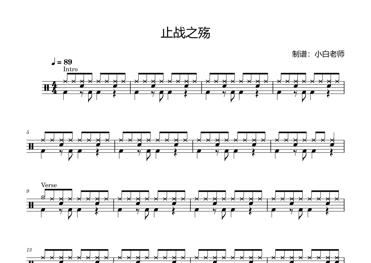 《止战之殇(初级版)》是初级版演唱的一首歌曲,拍号为4/4拍,歌曲速度为每分钟89拍,这份架子鼓谱共有三张高清图谱,图谱由 @琴魂用户_227975 编配上传,图谱使用五线谱编配,使用这份止战之殇(初级版)架子鼓谱,你将能够轻松地敲打出这首初级版的止战之殇(初级版),快来尝试吧。周杰伦的止战之殇架子鼓谱 简化版本,适合新手小白练习。