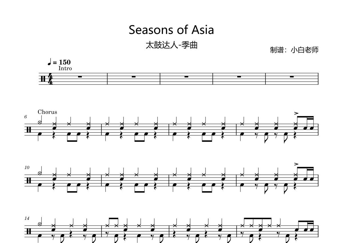 《Seasons of Asia》是太鼓达人 季曲演唱的一首歌曲,这份架子鼓谱共有三张高清图谱,图谱由 @苏小白 编配上传,图谱使用五线谱编配,使用这份Seasons of Asia架子鼓谱,你将能够轻松地敲打出这首太鼓达人 季曲的Seasons of Asia,快来尝试吧。太鼓达人 季曲 Seasons of Asia。