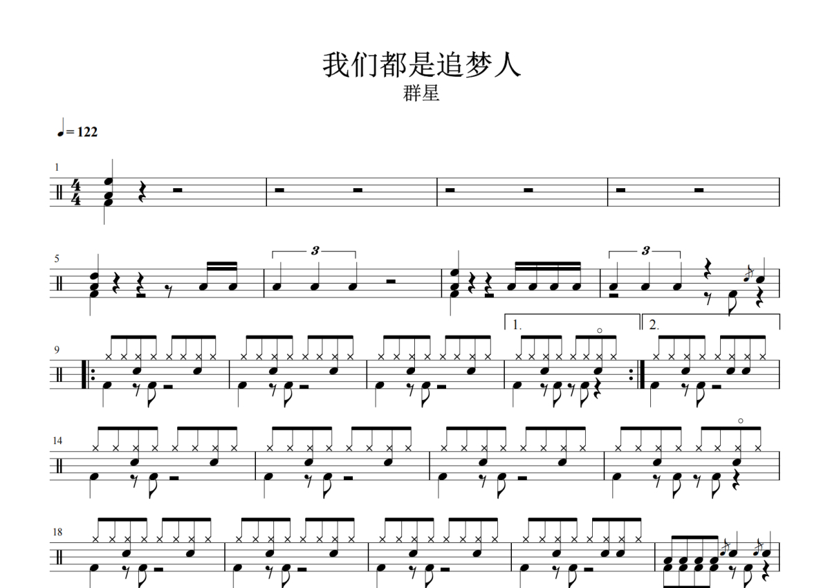 《我们都是追梦人》是群星演唱的一首歌曲,拍号为4/4拍,歌曲速度为每分钟122拍,这份架子鼓谱共有三张高清图谱,图谱由 @积极处世 编配上传,图谱使用五线谱编配,使用这份我们都是追梦人架子鼓谱,你将能够轻松地敲打出这首群星的我们都是追梦人,快来尝试吧。