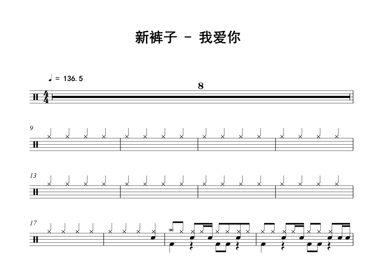 《我爱你》是新裤子演唱的一首歌曲,拍号为4/4拍,歌曲速度为每分钟136拍,这份架子鼓谱共有三张高清图谱,图谱由 @举个例子 编配上传,图谱使用五线谱编配,使用这份我爱你架子鼓谱,你将能够轻松地敲打出这首新裤子的我爱你,快来尝试吧。